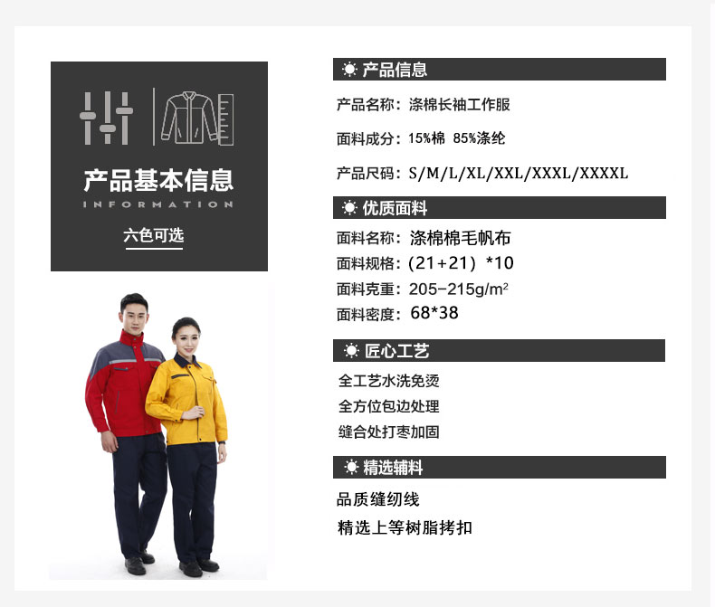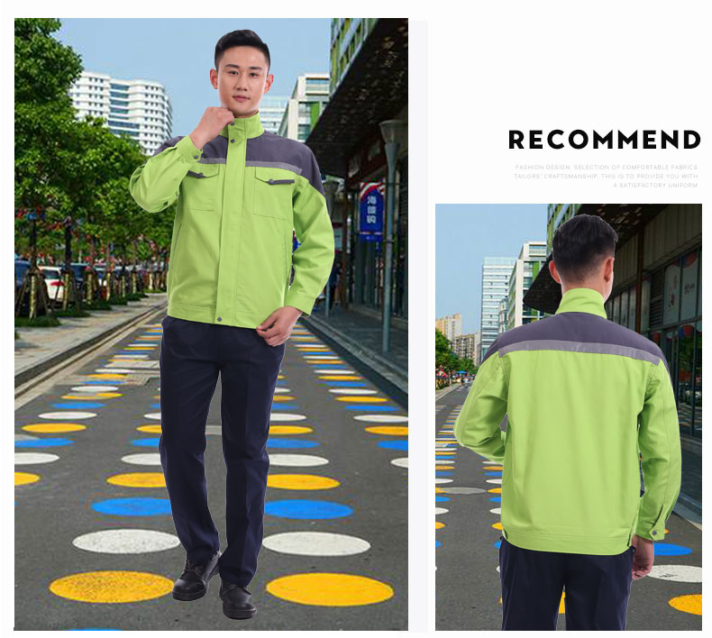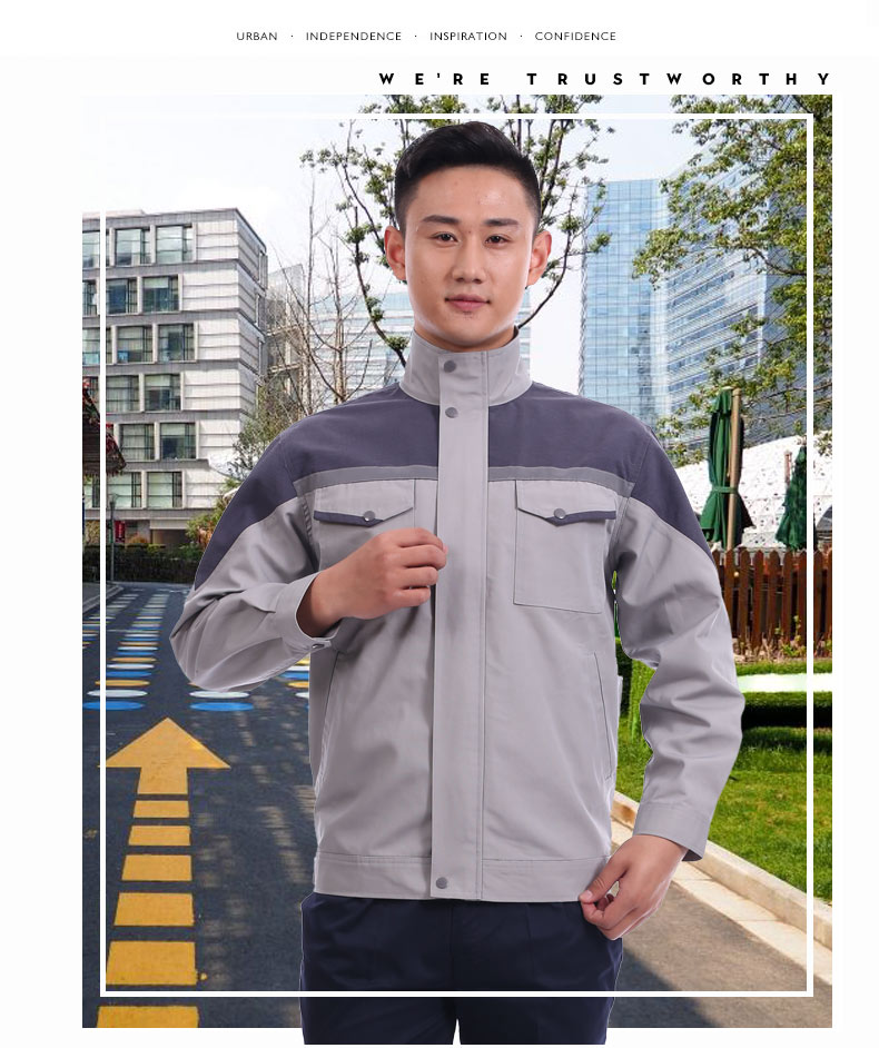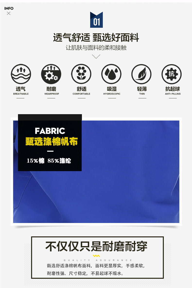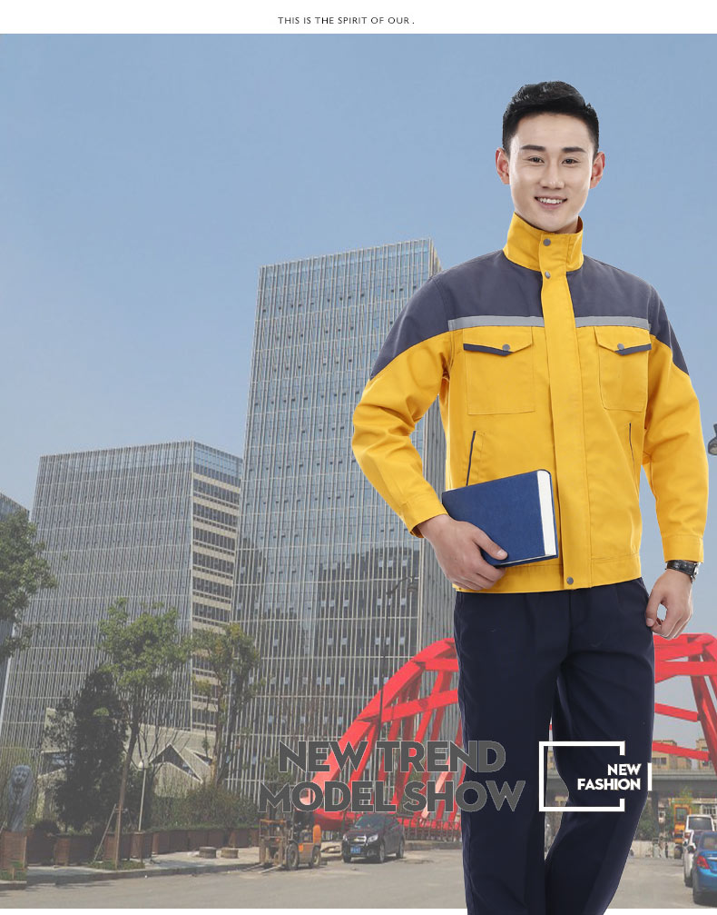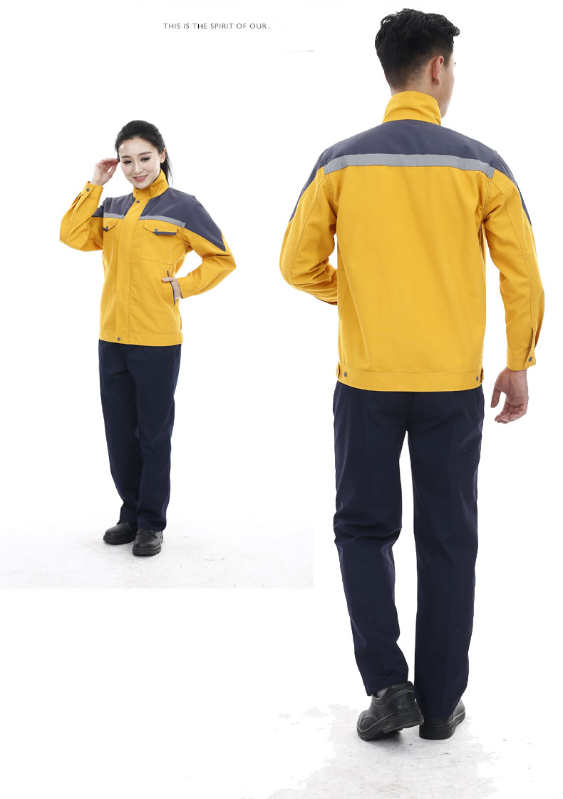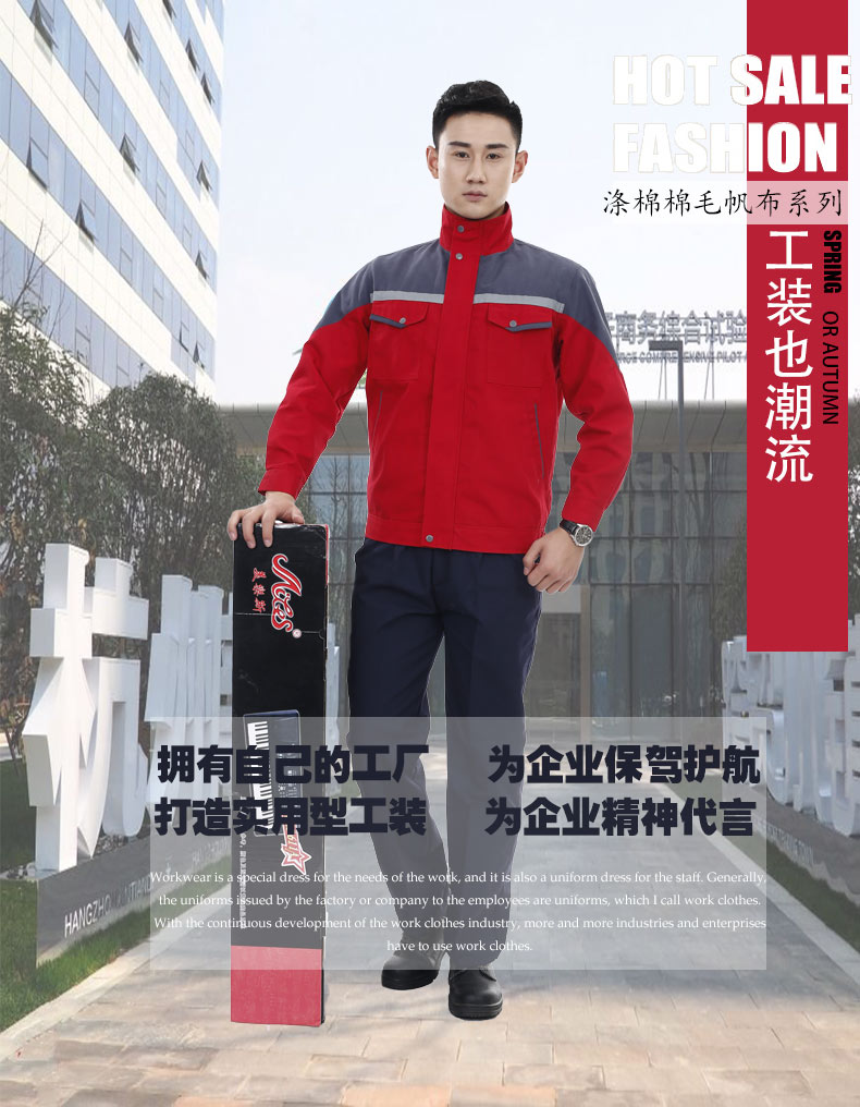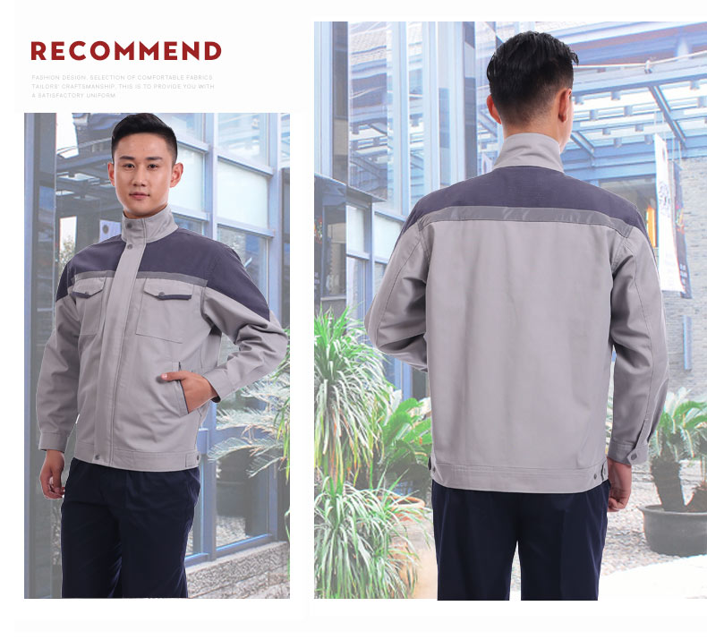 春秋裝工作服 GZFCQZ-6 采用滌棉棉毛帆布面料。手感柔軟。當然也可以用其他面料來訂制這款工作服。