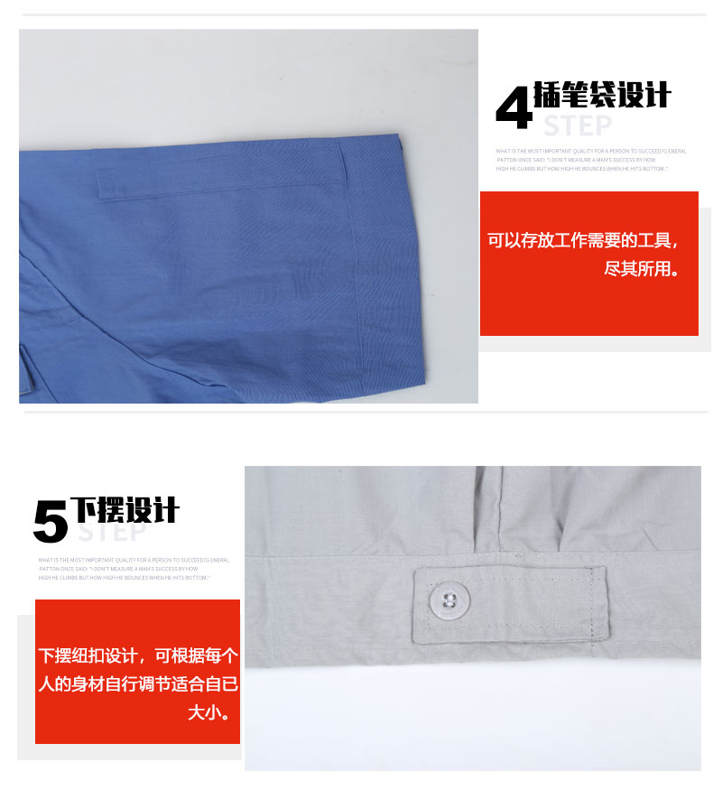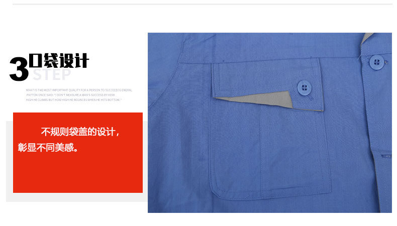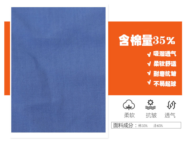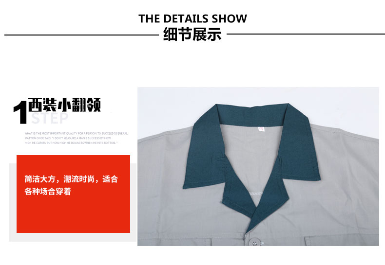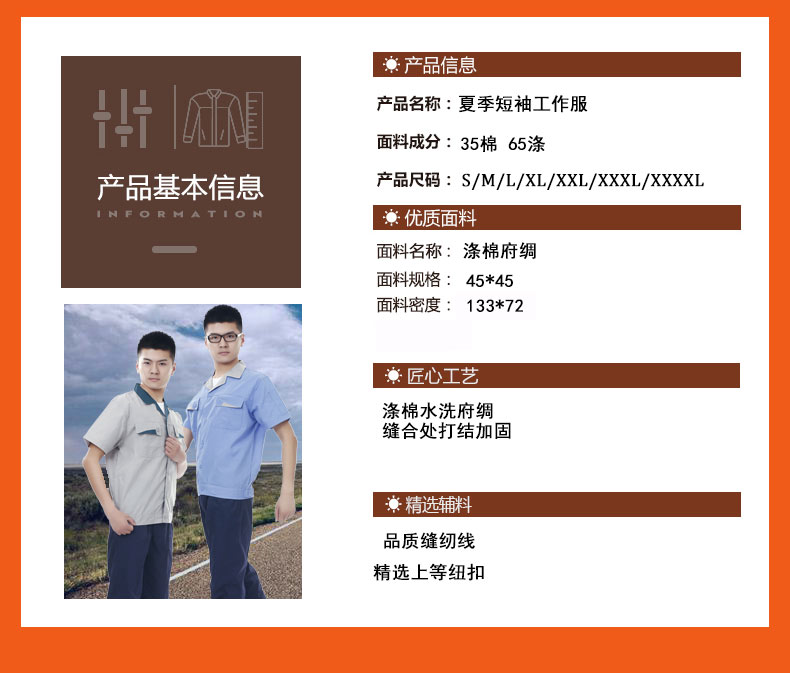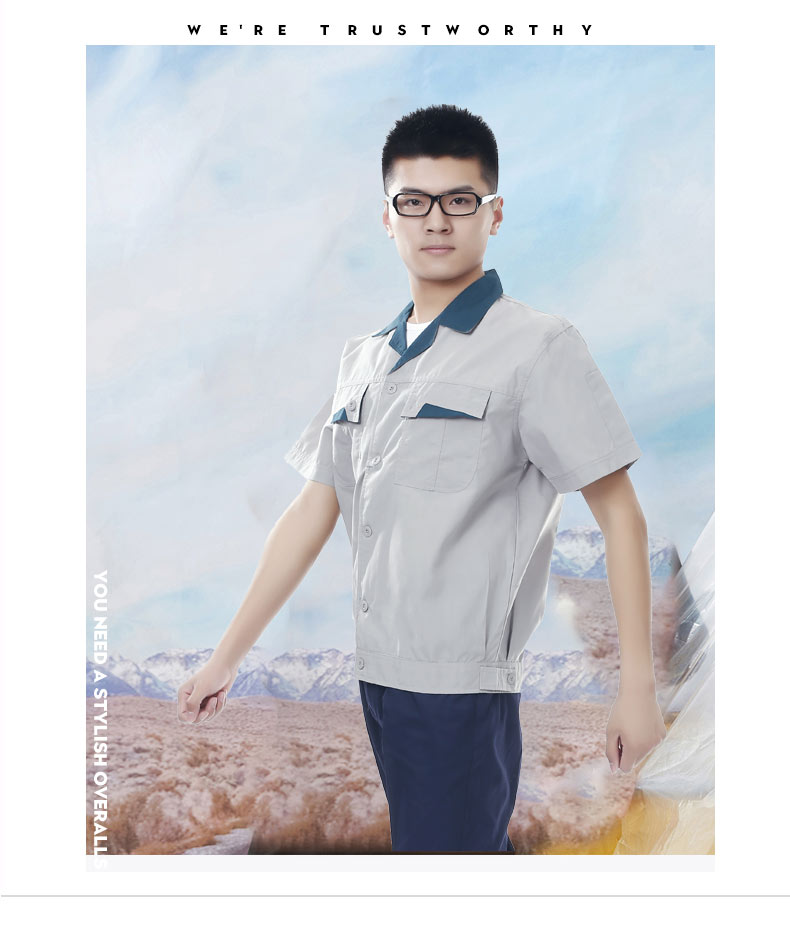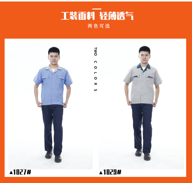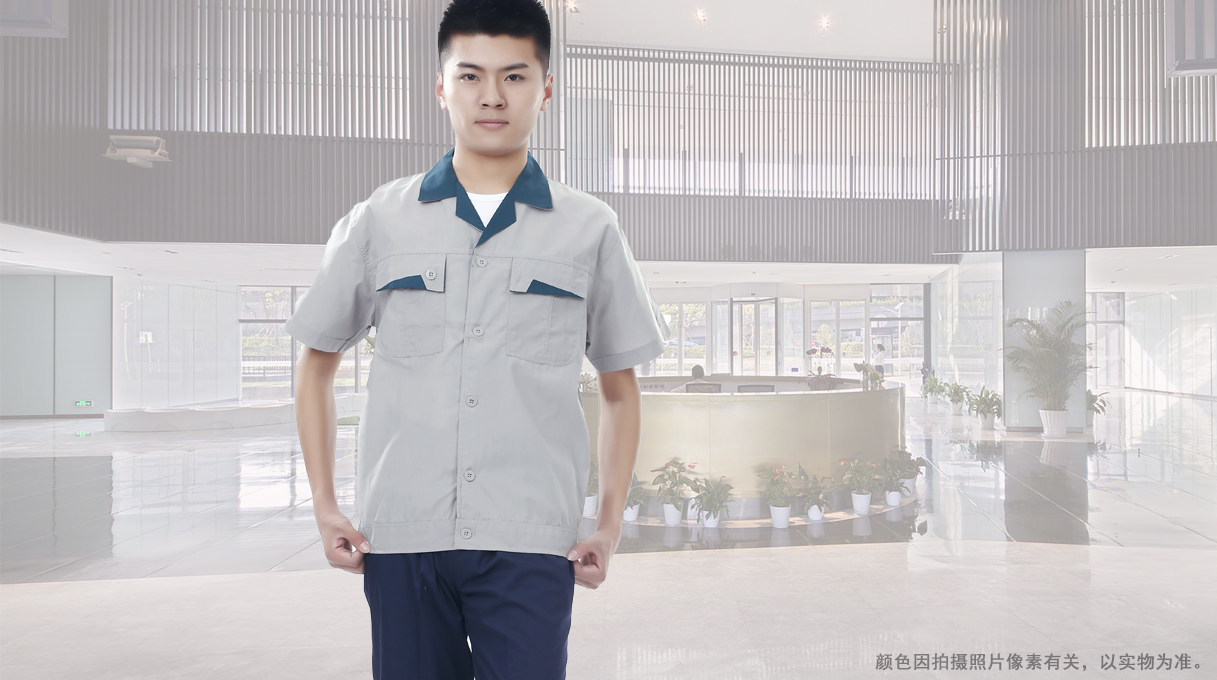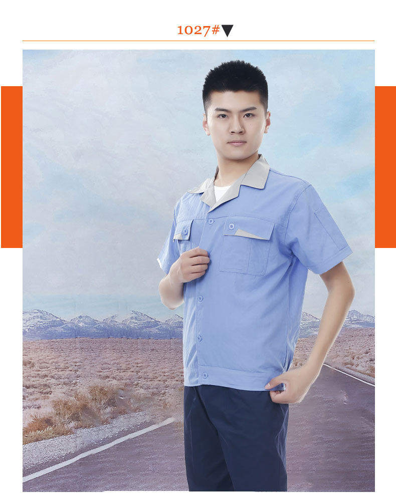 夏裝工作服 短袖工作服 GZFXZ-11,采用滌棉府綢面料,輕薄透氣。褲子是滌棉細斜紋,相對厚實些。