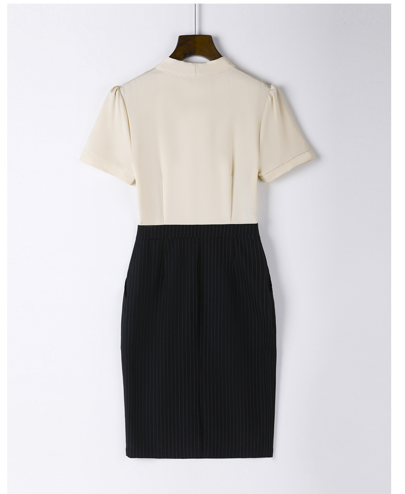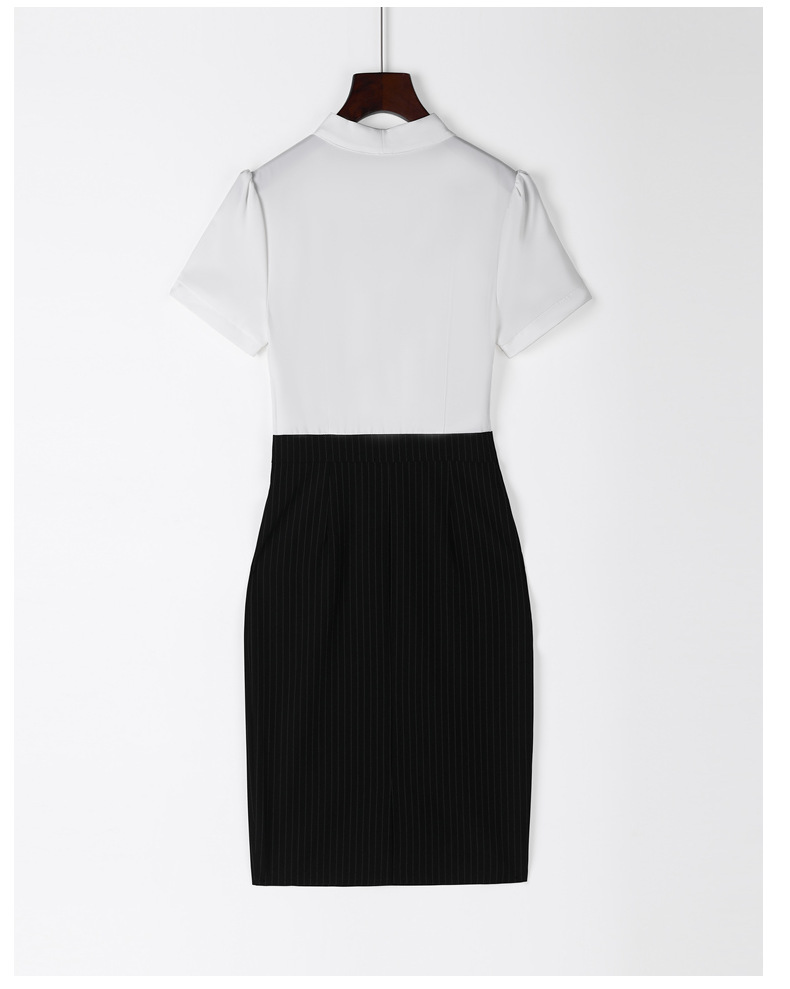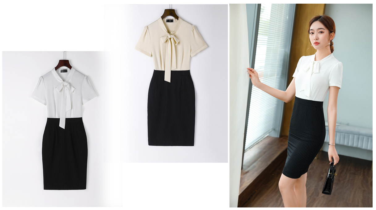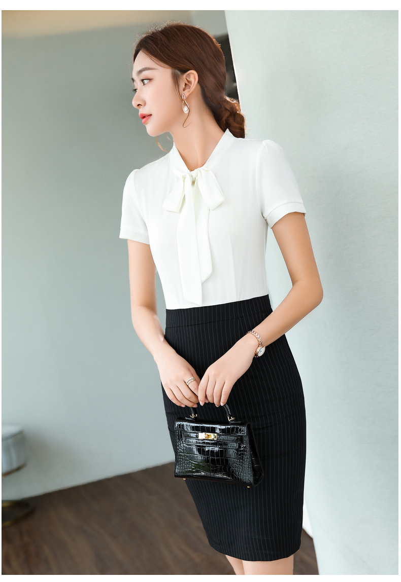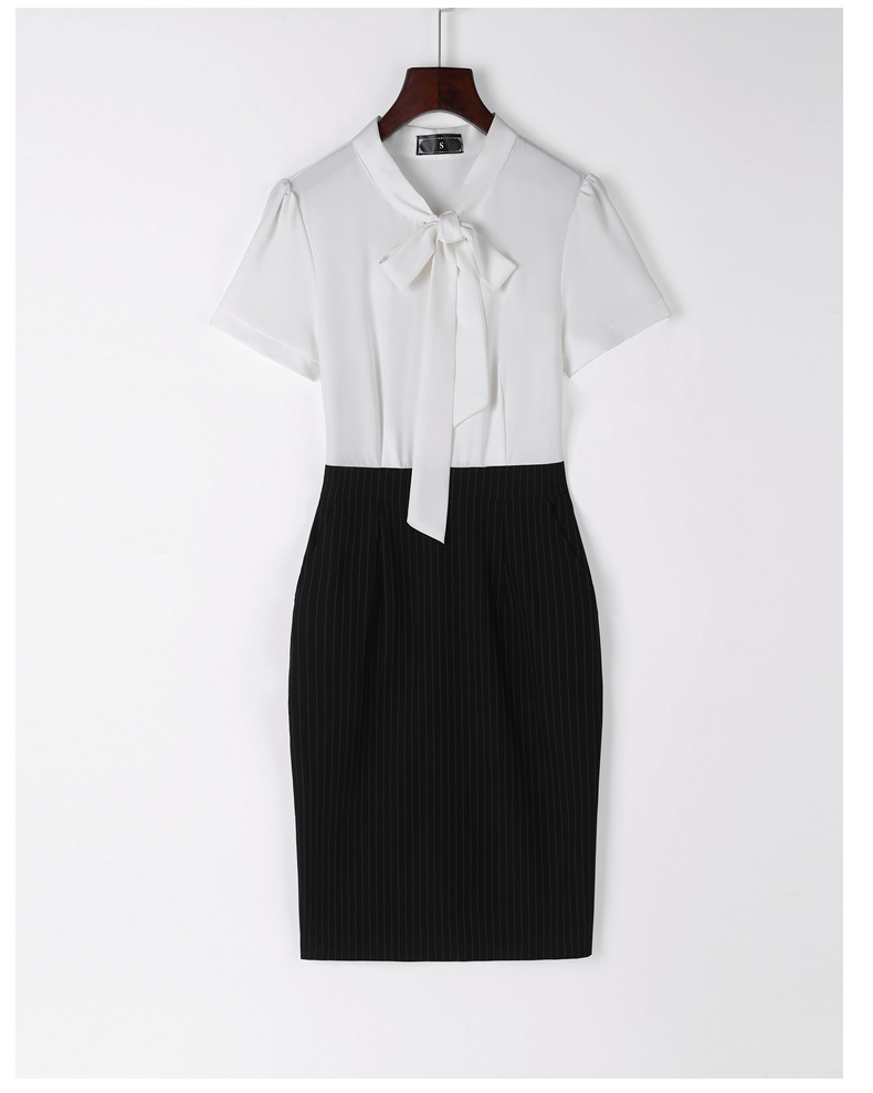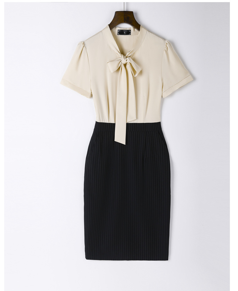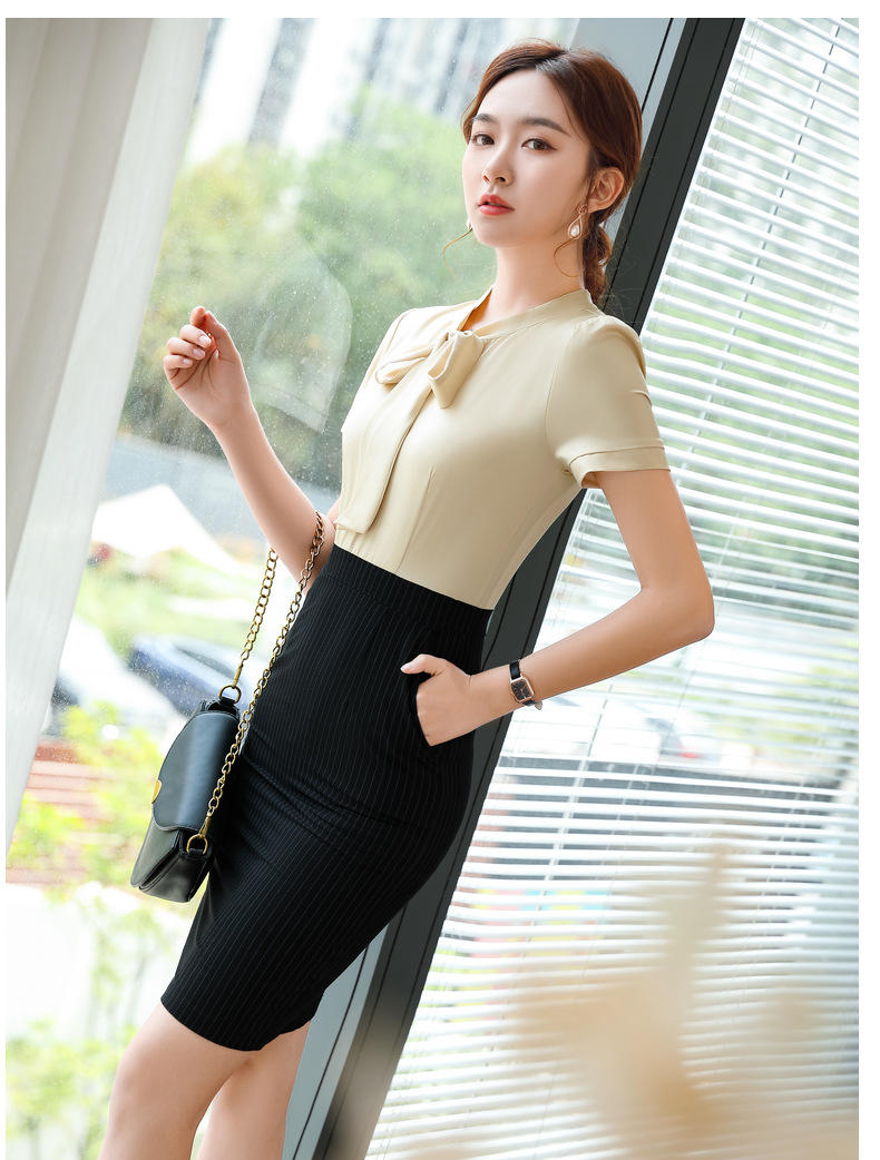 夏蝴蝶結珠寶工作服條紋美容酒店包臀高腰職業連衣裙...